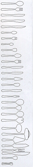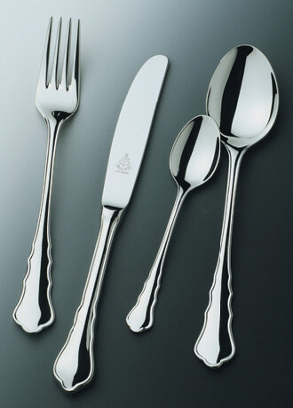 Menülöffel 202 mm Menügabel 202 mm Menümesser, Hohlheft 225 mm Menümesser, massiv 225 mm Steakmesser 220 mm Kaffeelöffel 140 mm Kuchengabel 146 mm Moccalöffel 110 mm Eislöffel 148 mm Dessertlöffel 185 mm Dessertgabel 185 mm Dessertmesser , Hohlheft 210 mm Dessertmesser, massiv 210 mm Fischmesser 196 mm Gourmetlöffel 185 mm Butterstreicher 187 mm Fleisch-/ Aufschnittgabel 178 mm Gemüselöffel 205 mm Sahnelöffel 172 mm Salatbesteck (2-teilig) 202 mm
