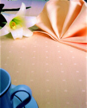Vollzwirn-Tischwäsche, Dessin: allover Steinchen Mischgewebe: 50% Polyester/ 50% Baumwolle, garngefärbt, mercerisiert, optisch aufgehellt, Gewicht: ca. 230 gr/qm, Wäsche: 80° C Sondergrößen: Im Dessin “Steinchen” bis 160 cm Breite. Im Dessin “uni glatt” bis 240 cm Breite. Farben: sekt, gelb, terrakotta, rubinrot