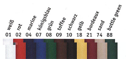 weiß, rot, marine, königsblau, gärtnergrün, toffee, schwarz, gelb, bordeaux, sand, bottle green